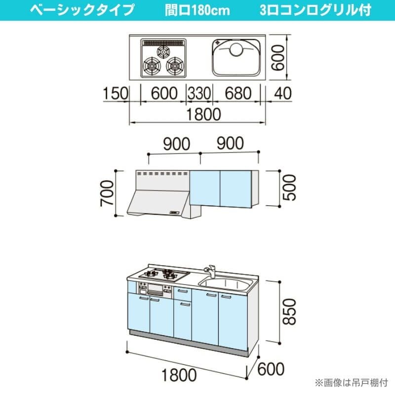コンパクトキッチン LIXIL 事務所 給湯室 アパート 寮 公団住宅 システムキッチン セカンド リフォーム コンパクトキッチン ティオ Tio LixiL 壁付I型 ベーシック W1800mm 間口180cm(グリル付き3口コンロ用) グループ3 リクシル システムキッチン 流し台