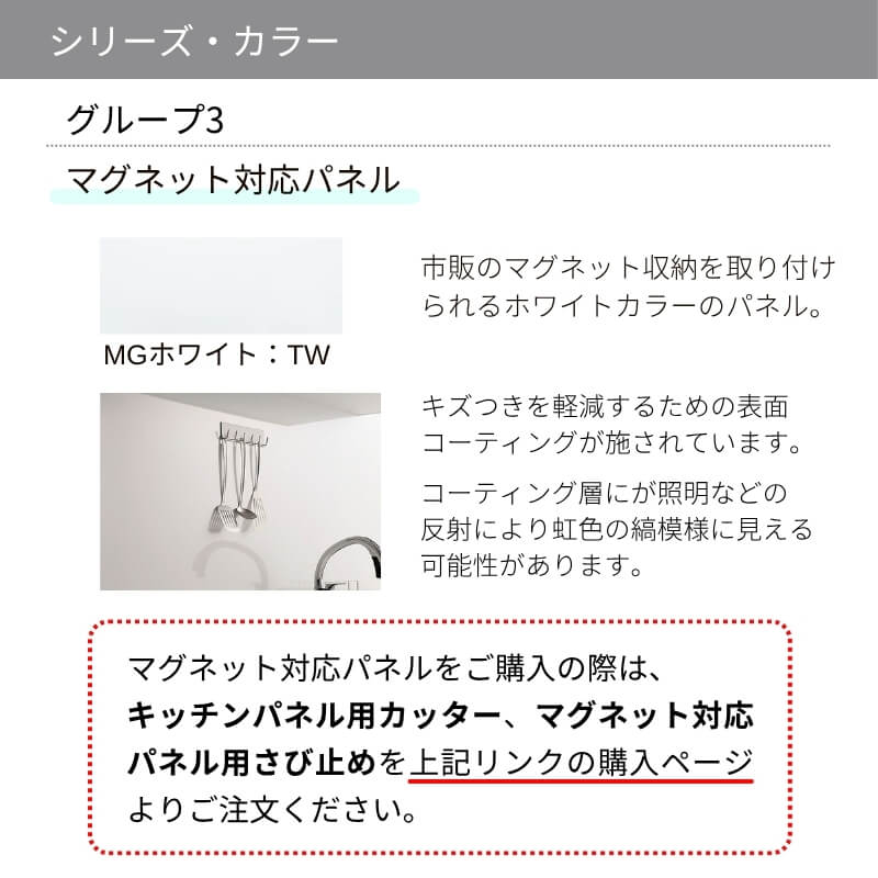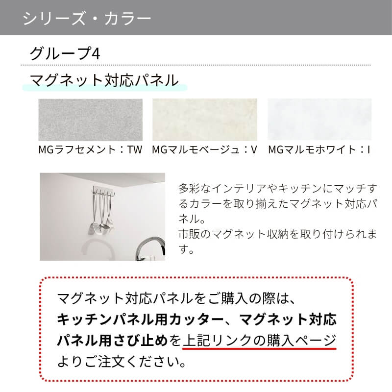 多彩なインテリアやキッチンにマッチするカラーを取り揃えたマグネット対応パネル。市販のマグネット収納を取り付けられます。