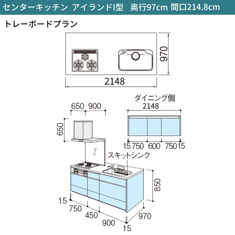 システムキッチン シエラ W2148mm アイランド I型トレーボードプラン 食洗機無し 間口214.8cm 奥行97/75cm グループ3 リクシル 流し台