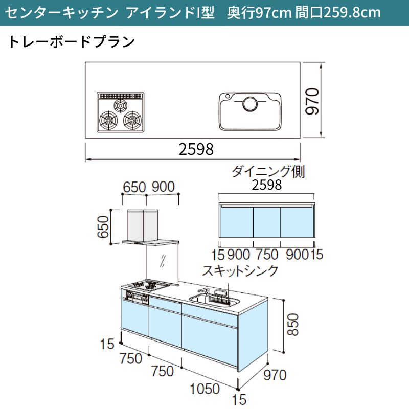 システムキッチン シエラ W2598mm アイランド I型トレーボードプラン 食洗機無し 間口259.8cm 奥行97/75cm グループ3 リクシル 流し台