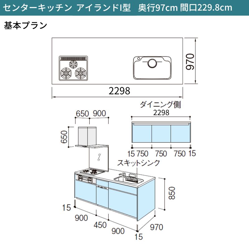 システムキッチン シエラ W2298mm アイランド I型基本プラン 食洗機無し 間口229.8cm 奥行97/75cm グループ3 リクシル 流し台