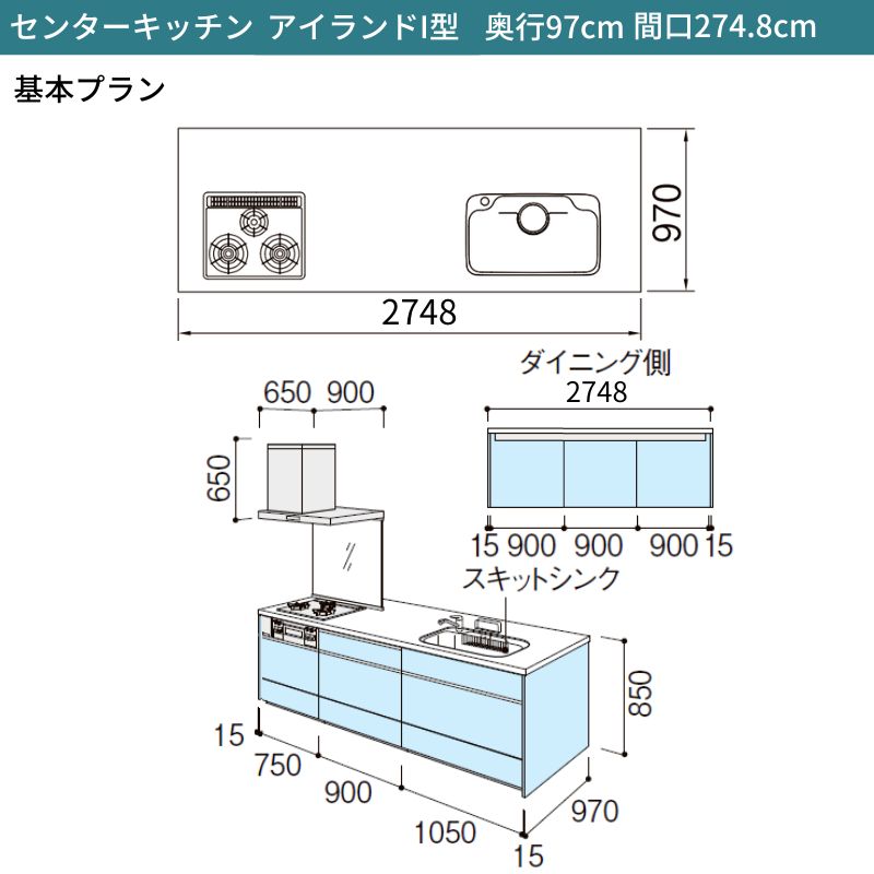 システムキッチン シエラ W2748mm アイランド I型基本プラン 食洗機無し 間口274.8cm 奥行97/75cm グループ2 リクシル 流し台