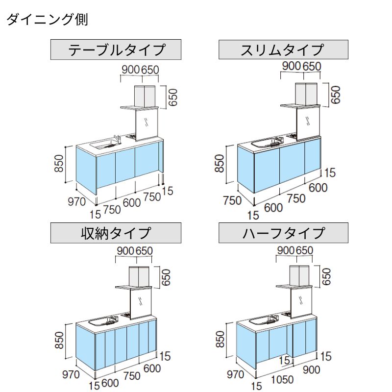 オプションからワークトップ(天板)、シンク、水栓金具、加熱機器(ガスコンロ、IHヒーター)、レンジフード(換気扇)、エンドパネルなどをセミオーダーできお好みの仕様にカスタマイズできます。