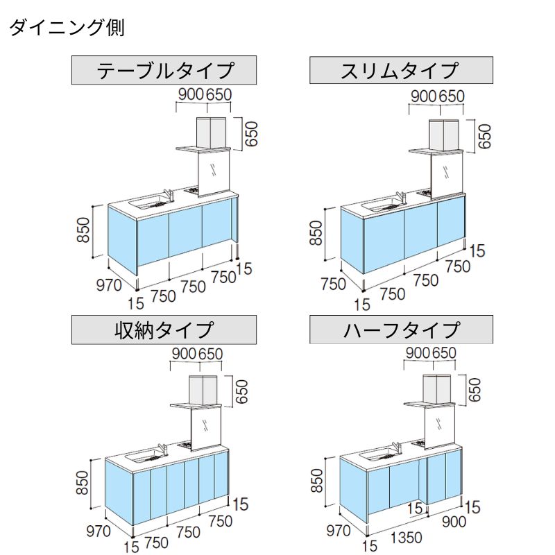 オプションからワークトップ(天板)、シンク、水栓金具、加熱機器(ガスコンロ、IHヒーター)、レンジフード(換気扇)、エンドパネルなどをセミオーダーできお好みの仕様にカスタマイズできます。