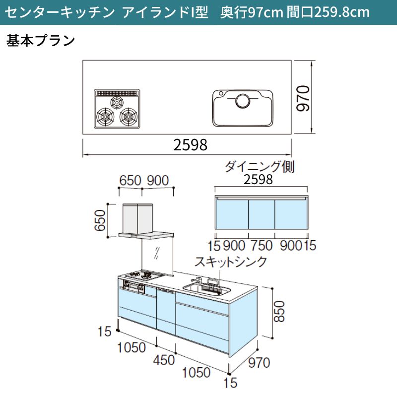 システムキッチン シエラ W2598mm アイランド I型基本プラン 食洗機付き 間口259.8cm 奥行97/75cm グループ2 リクシル 流し台