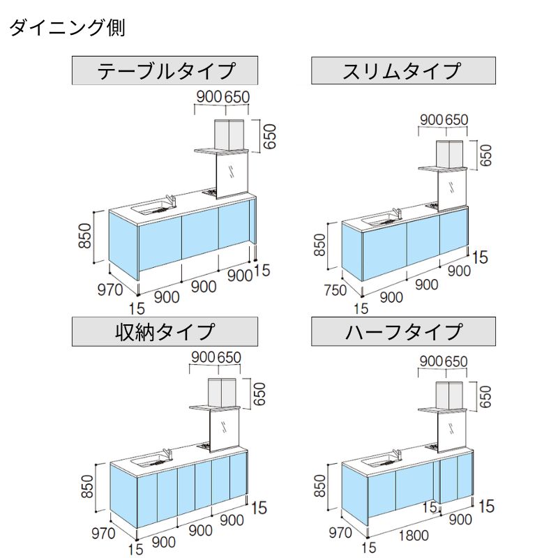 オプションからワークトップ(天板)、シンク、水栓金具、加熱機器(ガスコンロ、IHヒーター)、レンジフード(換気扇)、エンドパネルなどをセミオーダーできお好みの仕様にカスタマイズできます。