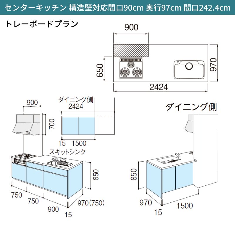 システムキッチン シエラ W2424mm 構造壁対応型トレーボードプラン 食洗機無し 間口242.4cm 奥行97/75cm グループ3 リクシル 流し台