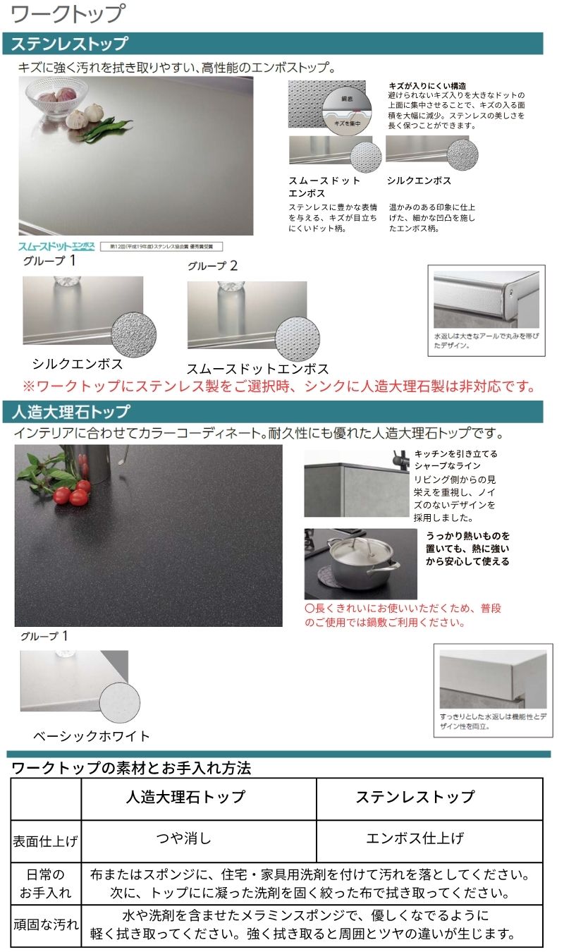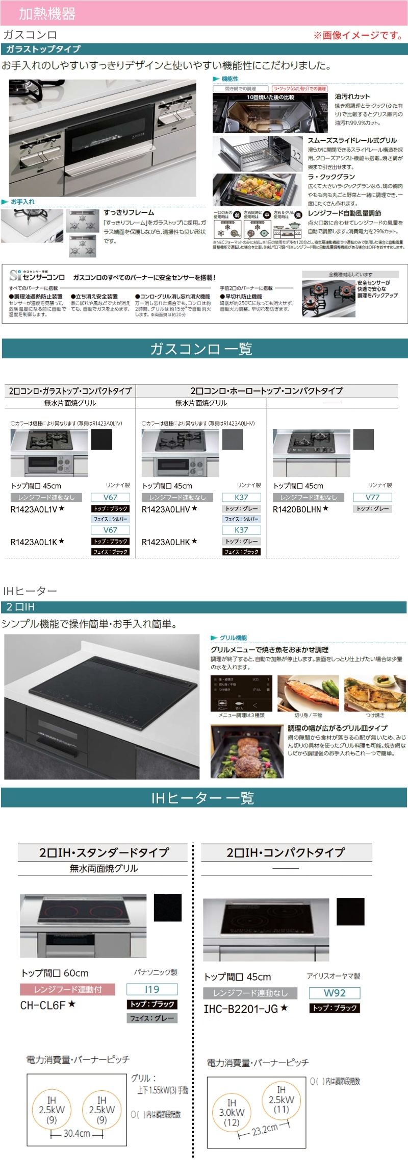 オプションからワークトップ(天板)、シンク、水栓金具、加熱機器(ガスコンロ、IHヒーター)、レンジフード(換気扇)、エンドパネルなどをセミオーダーできお好みの仕様にカスタマイズできます。