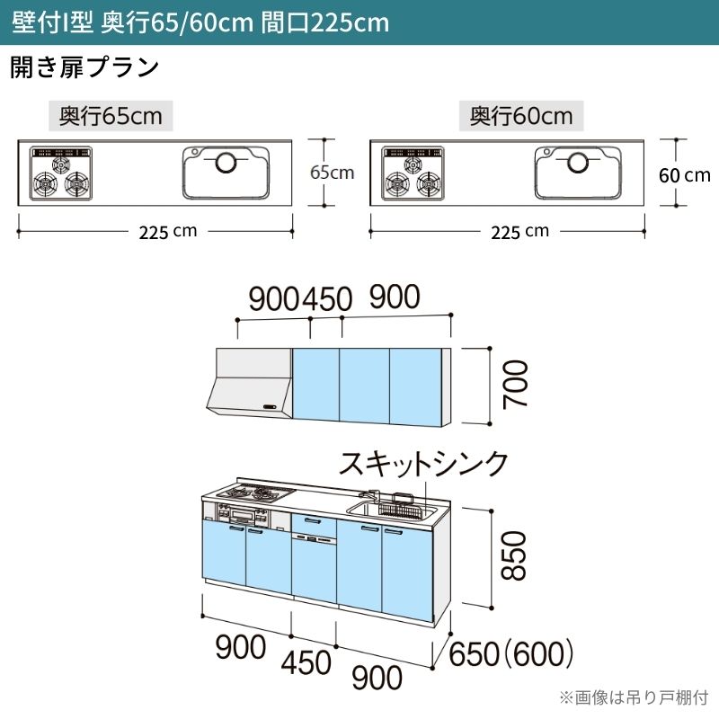 システムキッチン シエラ W2250mm 壁付I型 開き扉プラン ウォールユニット無 食洗機付き 間口225cm 奥行60cm グループ3 リクシル 流し台