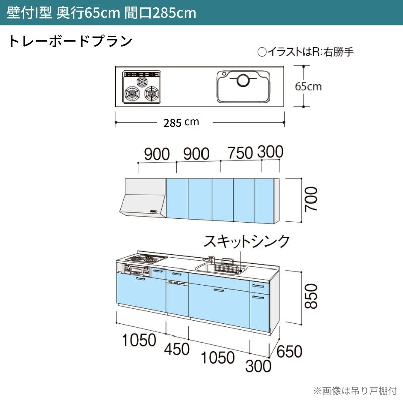 システムキッチン シエラ W2850mm 壁付I型 トレーボードプラン ウォールユニット無 食洗機付き 間口285cm 奥行65cm グループ1 リクシル 流し台