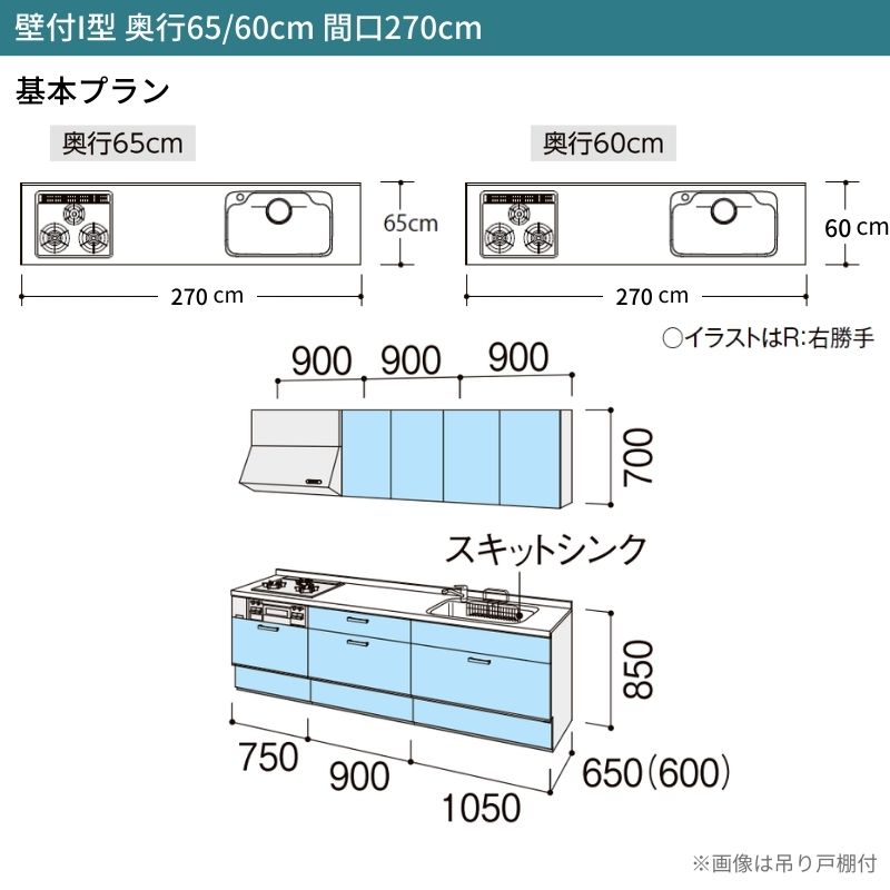 システムキッチン シエラ W2700mm 壁付I型 基本プラン ウォールユニット付 食洗機無し 間口270cm 奥行60cm グループ3 リクシル 流し台