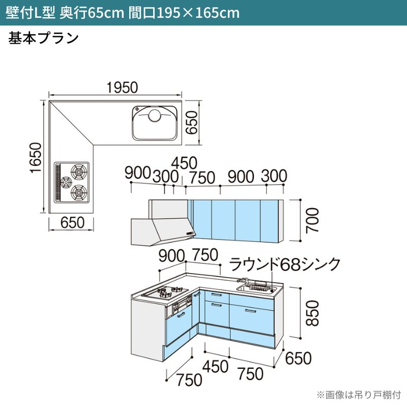 システムキッチン シエラ W1950mm 壁付L型 基本プラン ウォールユニット無 食洗機無し 間口195×165cm 奥行65cm グループ3 リクシル 流し台