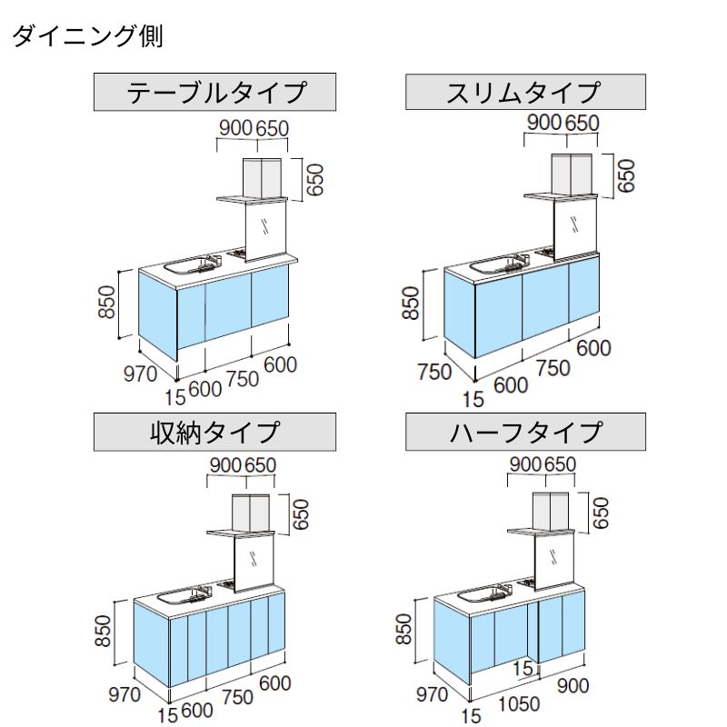 オプションからワークトップ(天板)、シンク、水栓金具、加熱機器(ガスコンロ、IHヒーター)、レンジフード(換気扇)、エンドパネルなどをセミオーダーできお好みの仕様にカスタマイズできます。