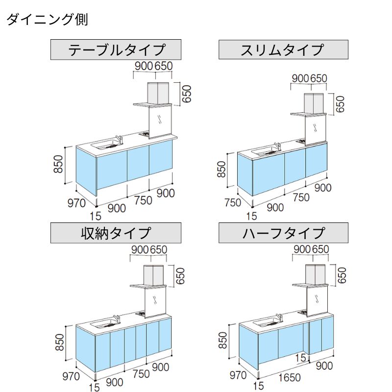 オプションからワークトップ(天板)、シンク、水栓金具、加熱機器(ガスコンロ、IHヒーター)、レンジフード(換気扇)、エンドパネルなどをセミオーダーできお好みの仕様にカスタマイズできます。