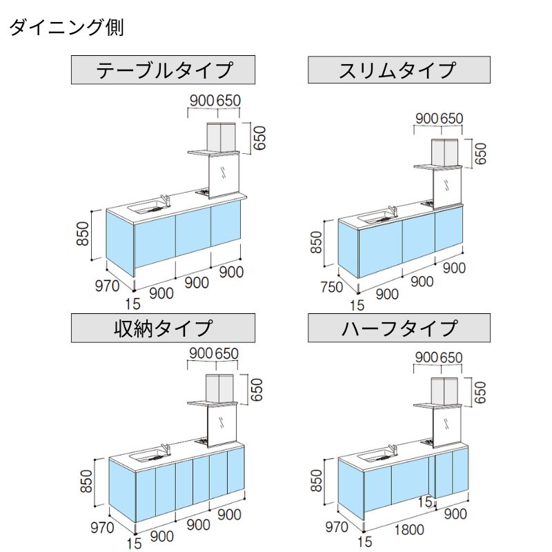 オプションからワークトップ(天板)、シンク、水栓金具、加熱機器(ガスコンロ、IHヒーター)、レンジフード(換気扇)、エンドパネルなどをセミオーダーできお好みの仕様にカスタマイズできます。