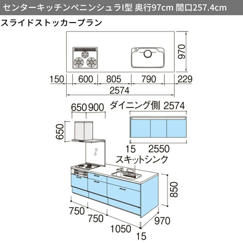 システムキッチン 流し台 本体 LIXIL 安い リフォーム おしゃれ システムキッチン リクシル シエラS センターキッチン ペニンシュラI型 スライドストッカープラン 食器洗い乾燥機付 W2574mm 間口257.4cm 奥行75/97cm グループ2 流し台 おしゃれ 可愛い システムキッチン セミオーダー リフォーム DIY