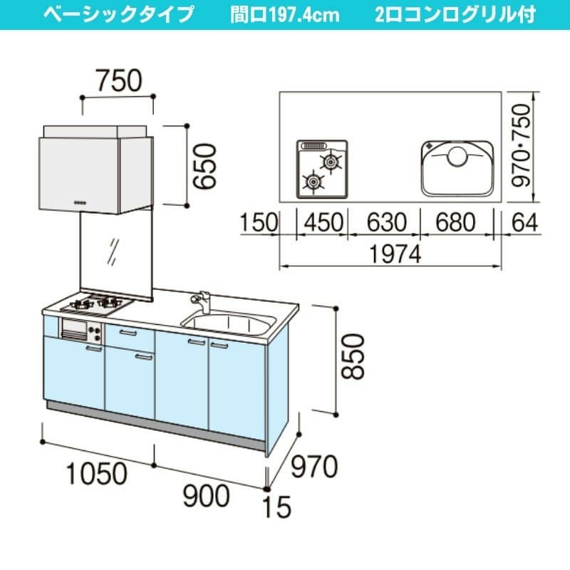 コンパクトキッチン LIXIL 事務所 給湯室 アパート 寮 公団住宅 システムキッチン セカンド リフォーム コンパクトキッチン ティオ Tio LixiL ペニンシュラI型 ベーシック W1974mm 間口197.4cm 奥行97cm(グリル付き2口コンロ用) グループ3 リクシル システムキッチン