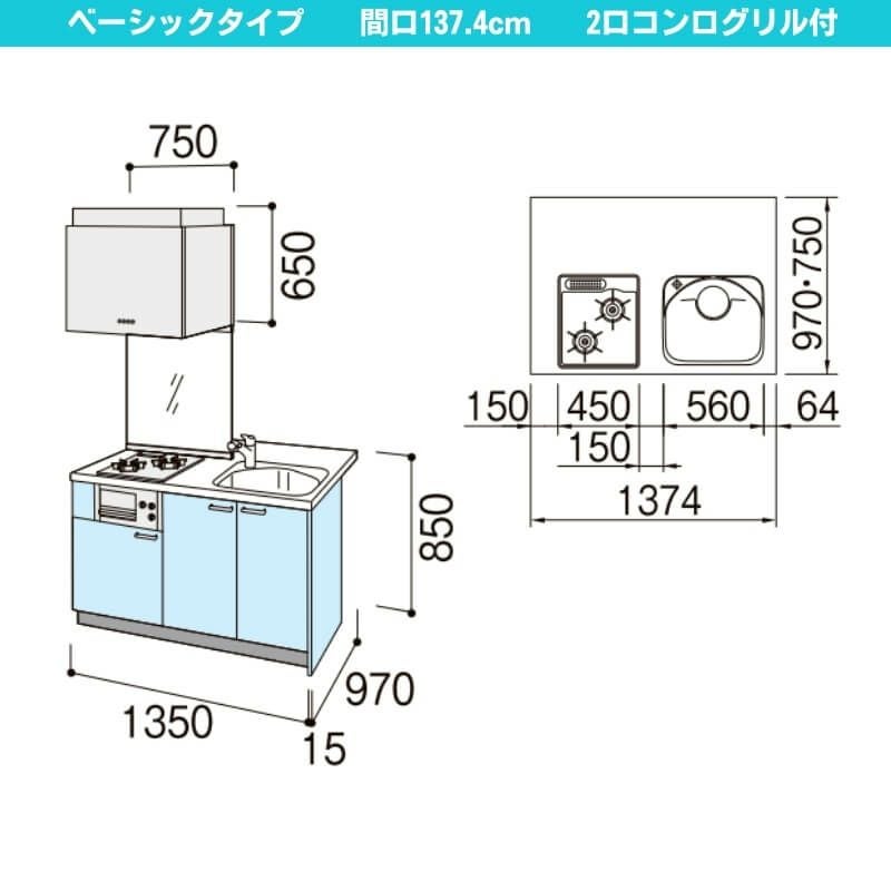 コンパクトキッチン LIXIL 事務所 給湯室 アパート 寮 公団住宅 システムキッチン セカンド リフォーム コンパクトキッチン ティオ Tio LixiL ペニンシュラI型 ベーシック W1374mm 間口137.4cm 奥行97cm(グリル付き2口コンロ用) グループ2 リクシル システムキッチン