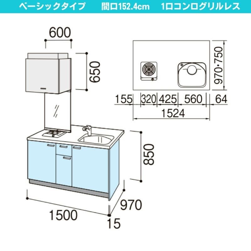 コンパクトキッチン LIXIL 事務所 給湯室 アパート 寮 公団住宅 システムキッチン セカンド リフォーム コンパクトキッチン ティオ Tio LixiL ペニンシュラI型 ベーシック W1524mm 間口152.4cm 奥行97cm(グリルなし1口コンロ用) グループ1 リクシル システムキッチン