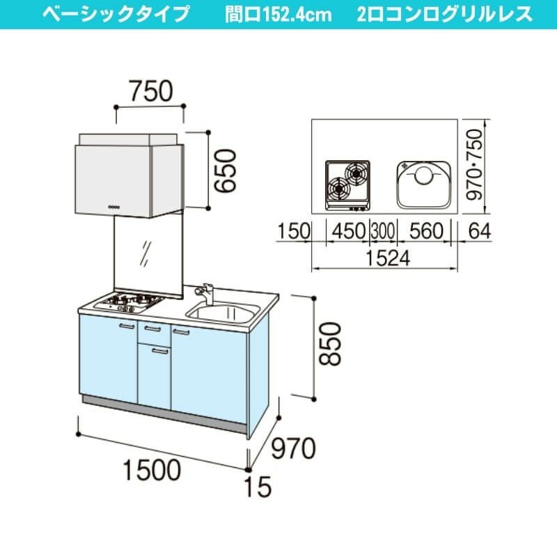 コンパクトキッチン LIXIL 事務所 給湯室 アパート 寮 公団住宅 システムキッチン セカンド リフォーム コンパクトキッチン ティオ Tio LixiL ペニンシュラI型 ベーシック W1524mm 間口152.4cm 奥行97cm(グリル付き2口コンロ用) グループ2 リクシル システムキッチン