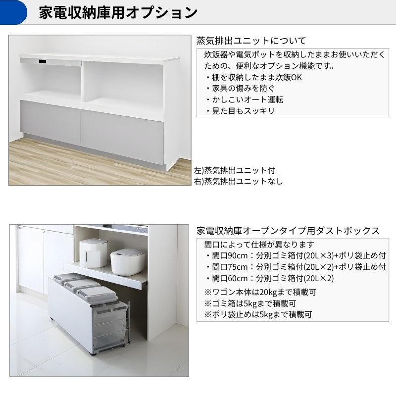 豊富な種類やサイズのキャビネットなどを組み合わせることで、設置スペースの広さや高さに合わせて機能的な住宅設備としてのキッチン収納を作ることができます。