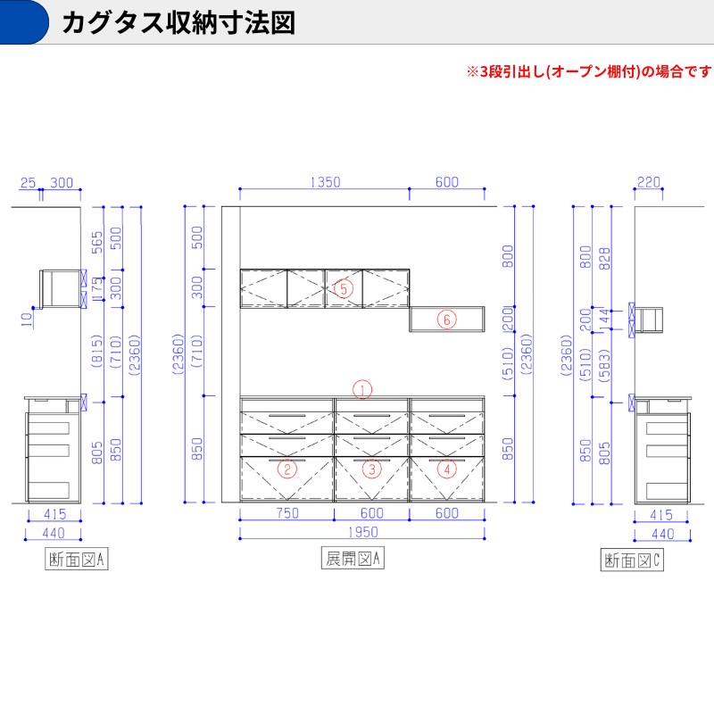 3段引出しはお皿やカトラリーなどの小物を効率よく収納できる引き出しタイプです。