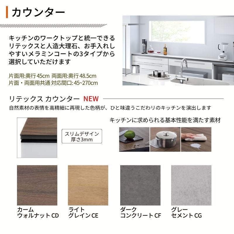 シンク・調理台・コンロ台が一列になったものです。シンプルな形状で壁付け・センターどちらも対応でき、リフォームで最も人気が高い形状です。