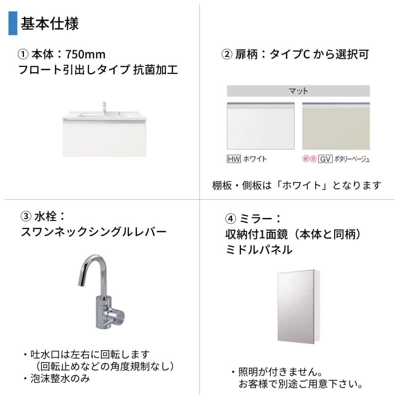 洗面台 パナソニック シーライン セットプラン GC-755M 扉柄タイプC 幅750 奥行530mm フロート引出しタイプ 抗菌加工 Panasonic D530 おしゃれ リフォーム DIY