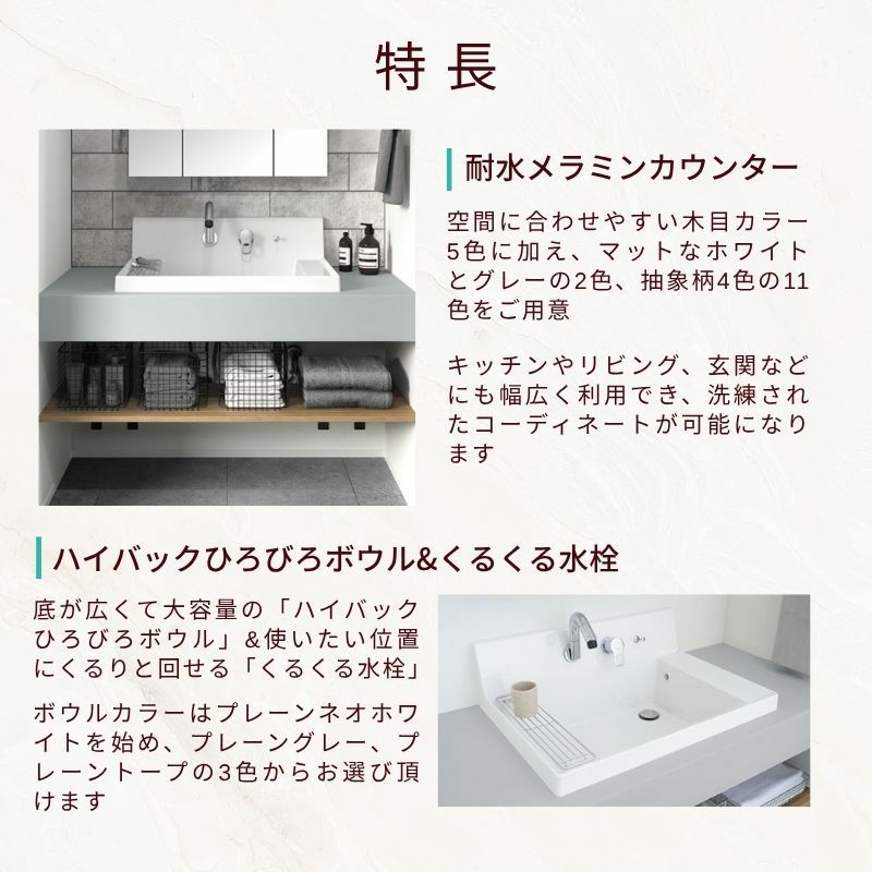 他の画像を見る 豊富なカラーでスタイリッシュで使いやすいカウンター洗面 洗面化粧台 カスタムバニティ カウンター間口950~1800mm 壁位置 両側壁 現場カット可 ボウル間口750mm ボウル位置中央 シャワー水栓 リクシル LIXIL 造作風 受注生産1ヶ月以内で発送 メーカー希望価格 ¥ 226,600 のところ 当店通常価格 ¥ 107,770 税込 会員特別価格 ¥ 104,530 税込 (0) 詳細を見る お気に入りに登録する
