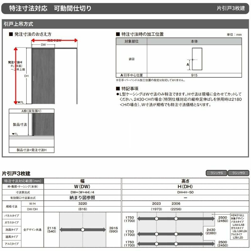 他の画像を見る リクシル 可動間仕切り 引戸|足元段差なしで部屋を自在に仕切る 【オーダーサイズ】可動間仕切り LIXIL 室内引戸 上吊方式 片引戸3枚建 ラシッサS パネルタイプ LBB ケーシング付枠 W2116~3916×H1750~2430 メーカーお取り寄せ10~12営業日で発送 メーカー希望価格 ¥ 435,160 のところ 当店通常価格 ¥ 217,580 税込 会員特別価格 ¥ 211,050 税込 (0) 詳細を見る お気に入りに登録する