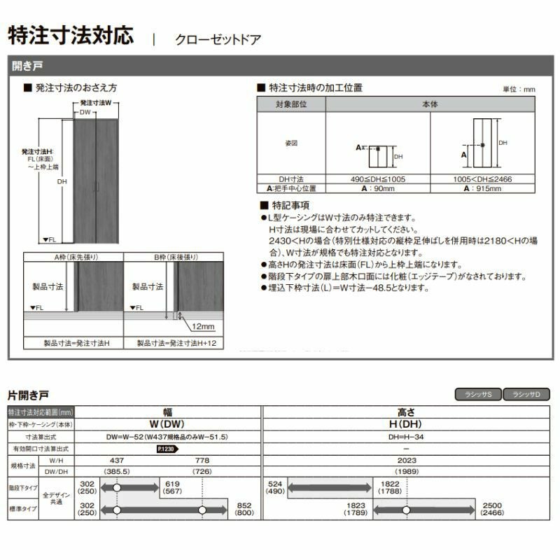 他の画像を見る リクシル ラシッサ クローゼット 特注 押入れ 収納 扉 【オーダーサイズ】 LIXIL クローゼットドア 2枚折れ戸 ラシッサS すっきりタイプ LAA ノンケーシング枠 W517~917mm×H1518~2425 ミラー無 メーカーお取り寄せ10~12営業日で発送 メーカー希望価格 ¥ 123,640 のところ 当店通常価格 ¥ 61,820 税込 会員特別価格 ¥ 59,900 税込 詳細を見る お気に入りに登録する